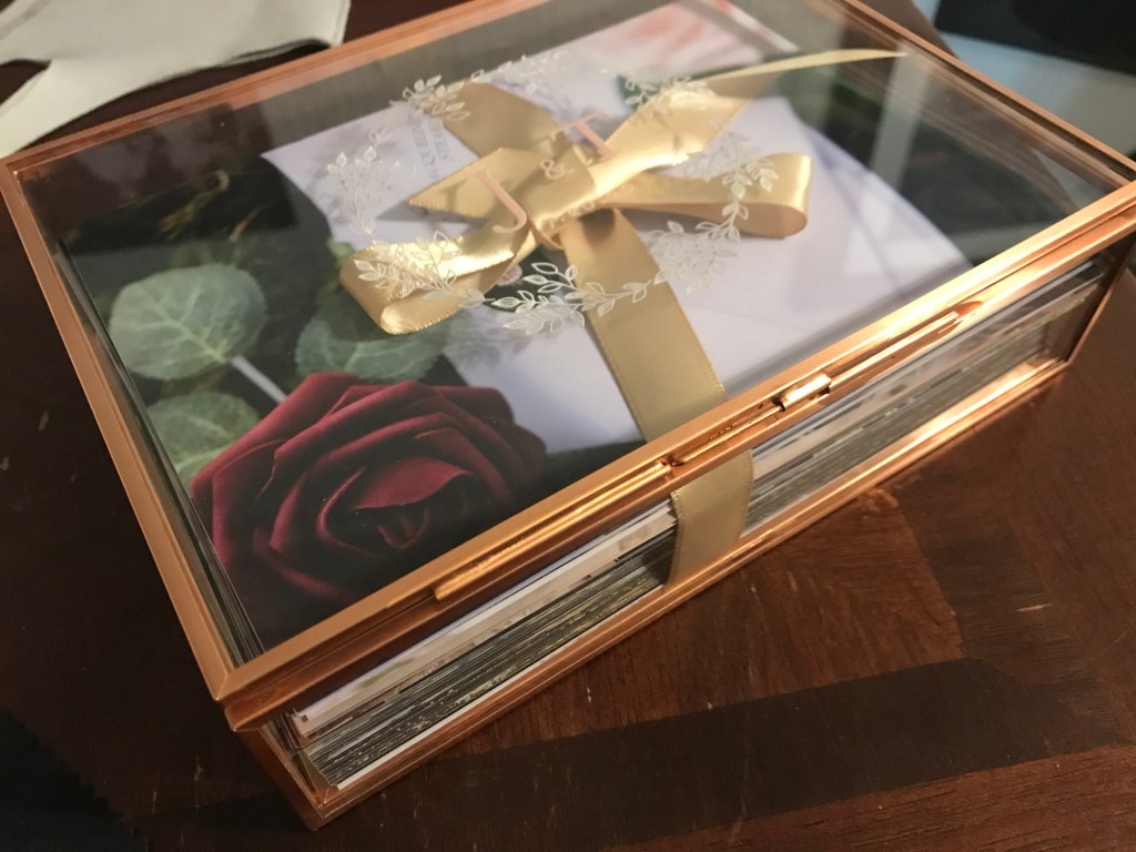 For our first anniversary, I got my husband a glass case with printed photos from our wedding. This case has a home on the wall mounted shelf under the tv, central in our living room yet out of toddler reach.